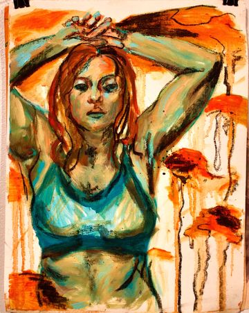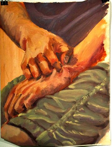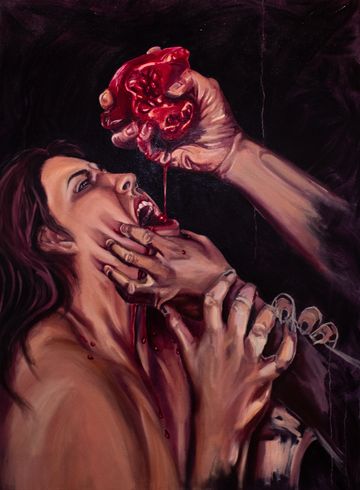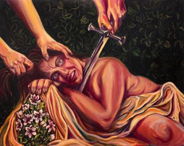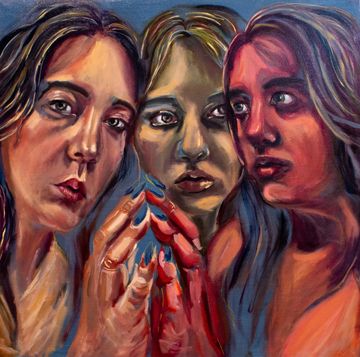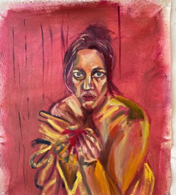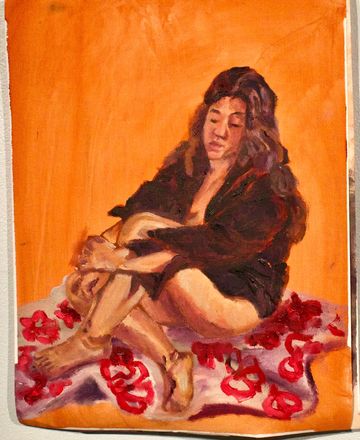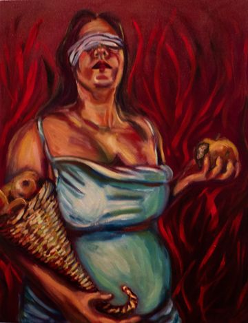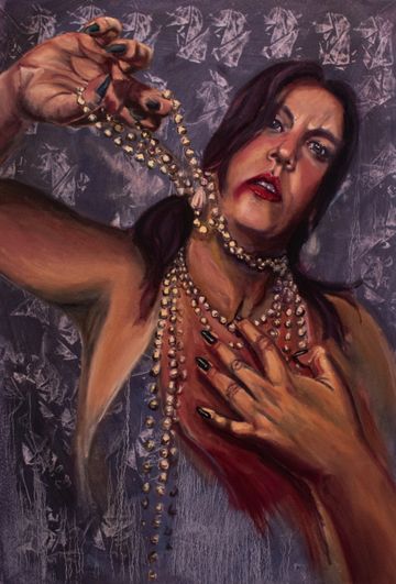 Oil paint on repurposed fabric, lace, and freshwater pearls