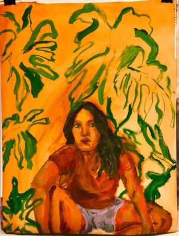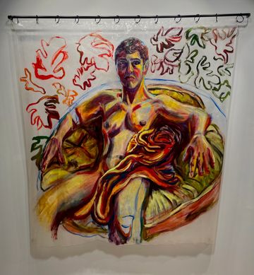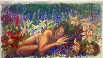 Oil paint on repurposed table cloth, lace, glass beads, and freshwater pearls